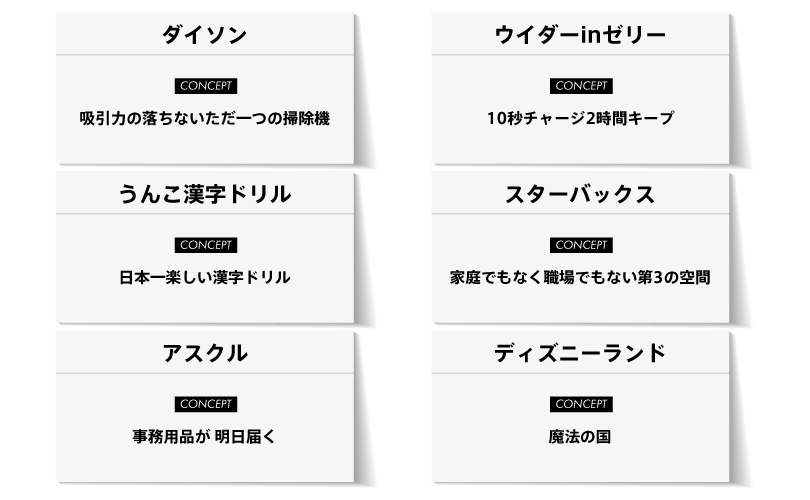 コンセプトは目的と違い、目的は最終的なゴールで「こうありたい」「こうしたい」ということを指しますが、コンセプトは最終形だけでなく、はじめから終わりまで一貫した考え方を意味します。