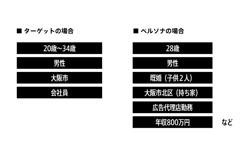 ターゲットが「同じ属性を持つユーザーのグループ」を表すものであるとすると、ペルソナはそうしたグループを代表する「一人の人物」を表すものだということができます。